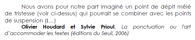 Dans le texte d’introduction à leur ouvrage, intitulé La longue marche d’Homo ponctuatus, à l’évocation de tous les signes de ponctuation qui furent inventés, les auteurs se sont pris au jeu de « renouer avec ces années d’innovation » en ajoutant un nouvel article au « magasin des curiosités typographiques » : le point de dépit mêlé de tristesse, qu’ils font suivre d’un exemple, d’après une citation d’Hector Bianciotti prélevée dans le magazine Télérama :