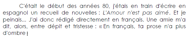 « Je lus les trente premières pages en couvrant les marges de points d’interrogation et d’exclamation, en face de phrases comme celle-ci : « Les pères ne font pas de confidences. S’ils en font, c’est signe de faiblesse ou de mort. » Parfois, les points d’exclamation ne suffisaient plus. Tout un passage m’était consacré. Que faire ? Points d’interrogation ou points d’exclamation ? Inventer des points d’imprécation ? De résignation ? »